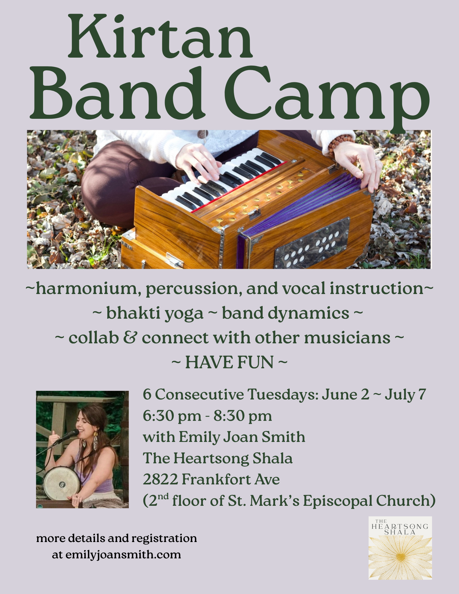 Join us for Kirtan Band Camp at The Heartsong Shala this summer of 2026! During this 6 week course, we will learn a variety of sanskrit chants together, along with specific harmonium, percussion, and vocal instruction for each chant. Students are welcome to either focus on one instrument only (harmonium, percussion, voice, or even another instrument of choice), and/or can spend time alternating focus, playing/singing a variety of instruments during the span of the course.
